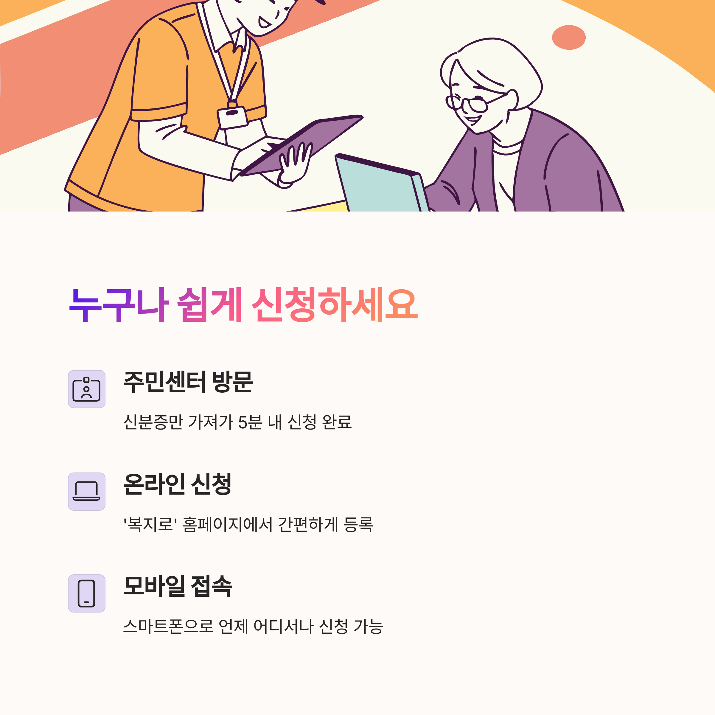 1️⃣ 주민센터 방문 신청: 신분증만 지참하면 담당 공무원이 가입 절차를 안내하며 즉시 등록 가능합니다.
